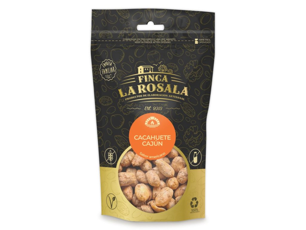 Zloženie :Arašidy bez škrupín (96 %), soľ, Cajun (soľ, paprika, kurkuma, koriander, rasca, cesnak, korenie, kajenské korenie, tymián a oregano) (2 %), pálivá paprika La Vera* a paprika La Vera*. * Zložky organického pôvodu. Môže obsahovať stopy iných orechov.