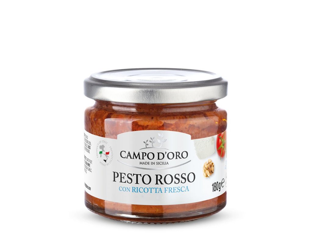 Složení: rajčatová dřeň 38 %, slunečnicový olej, rajčatový protlak, čerstvý sýr ricotta (syrovátka z MLÉKA, ovčí a kozí MLÉKO (min. 10 %), sůl, regulátor kyselosti: kyselina mléčná) 7 %, bazalka, VLAŠSKÉ OŘECHY 3 %, extra panenský olivový olej, vinný ocet, česnek, sůl, pálivá paprika, regulátor kyselosti: kyselina mléčná, kyselina askorbová.