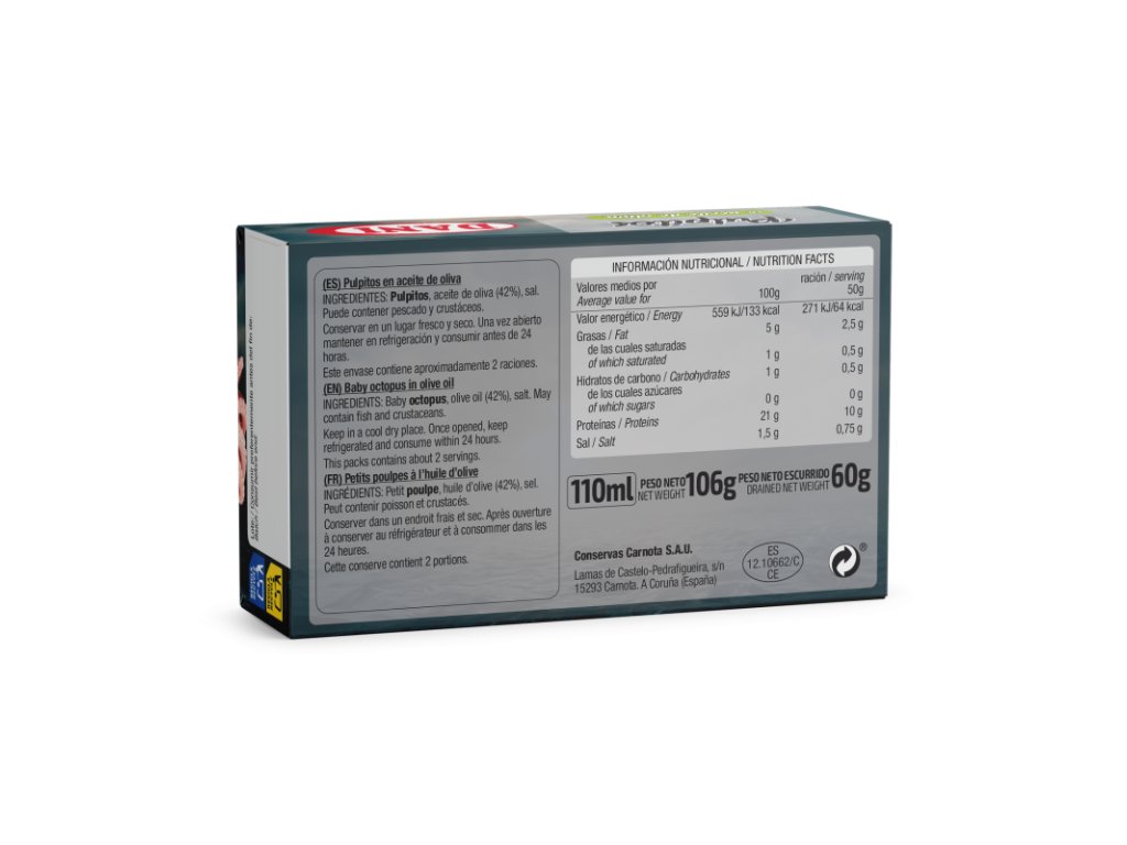 Chobotničky v olivovom oleji: , slnečnicový (42%), soľ. Môže obsahovať ryby a kôrovce. Po otvorení skladujte na chladnom a suchom mieste v chladničke a spotrebujte do 24 hodín.