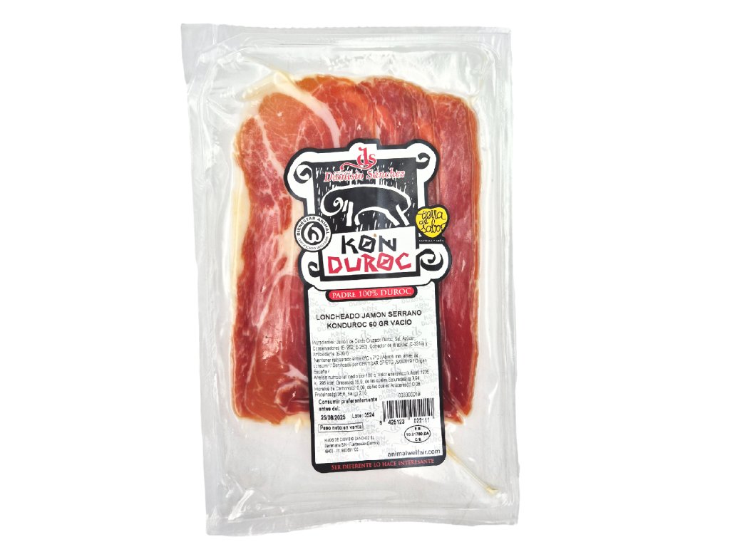 Zloženie: Jamón z rasy Duroc, soľ, cukor, konzervanty (E-252, E-250), regulátor kyslosti (E-331iii) a antioxidant (E-301).