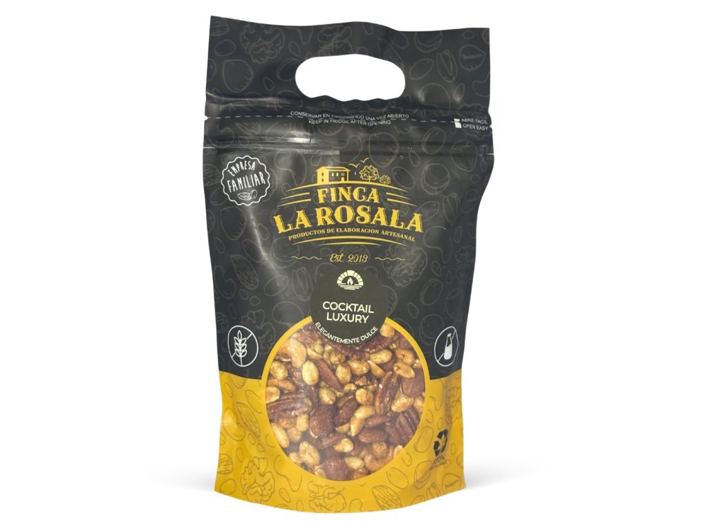 Objev svět výjimečné chuti a elegance s naší směsí Cocktail Luxury. Tato unikátní kombinace spojuje naše nejoblíbenější ořechy – arašídy bez slupky, mandle Valencia, kešu a pekany – ručně pražené s bio třtinovým cukrem a jemným dotekem mořské soli.